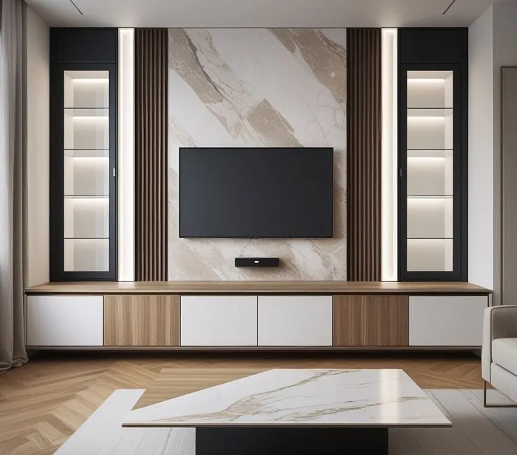 Роскошная и сдержанная ТВ-зона, выполненная в минималистичном стиле. Центр композиции — декоративная панель с текстурой светлого мрамора, подчёркнутая вертикальными деревянными рейками. По бокам — застеклённые витрины с подсветкой. Нижняя часть — широкая тумба с матовыми фасадами и вставками из шпона натурального дуба.