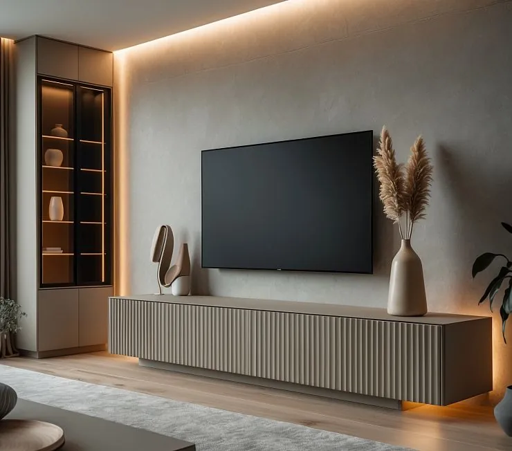 Элегантная ТВ-композиция в стиле современной минималистики. Основной акцент — на объемной тумбе с вертикальными рифлеными фасадами в теплом бежево-сером оттенке. Левая часть дополнена витриной с подсветкой, создающей мягкую атмосферу. Подсветка по периметру стены визуально увеличивает пространство и придаёт композиции завершённый вид. Идеально вписывается в интерьеры в стиле Japandi, современная классика, минимализм.