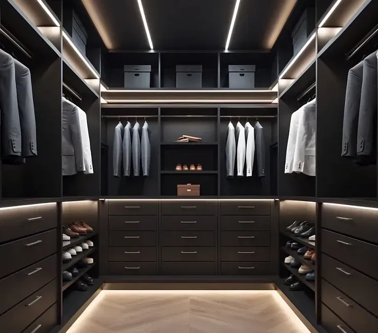 Гардеробная в мужском стиле с фасадами и корпусом из ЛДСП тёмного цвета. Встроенная светодиодная подсветка подчёркивает геометрию модулей. Пространство продумано для деловой одежды: множество выдвижных ящиков, открытых полок, секции под обувь и штанги на разной высоте. Дизайн лаконичен и функционален, идеально подходит для современного интерьера.