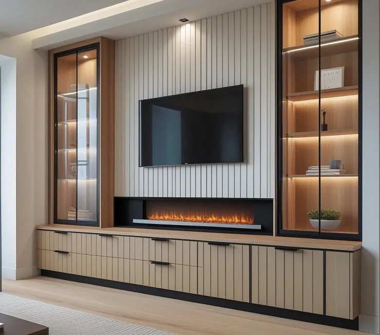 Эффектная и функциональная стенка для гостиной в современном стиле. В центре — телевизор на фоне вертикальной декоративной рейки и встроенный электрический камин с широким огненным эффектом. Боковые витрины с подсветкой оформлены стеклянными фасадами и деревянными вставками. Нижняя часть включает вместительные выдвижные ящики с вертикальной фрезеровкой и стильной чёрной фурнитурой. Светодиодная подсветка придаёт уют и подчёркивает архитектуру композиции.