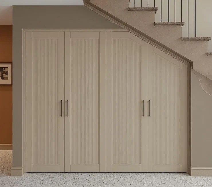 Встроенный шкаф под лестницей в современном стиле, выполненный в нежном бежевом цвете. Фасады украшены аккуратным вертикальным рифлением, создающим изысканную текстуру и визуально вытягивающим пространство. Удобные длинные ручки из матового металла обеспечивают комфортное открывание, а продуманная компоновка секций подходит для хранения одежды, обуви и бытовых принадлежностей.