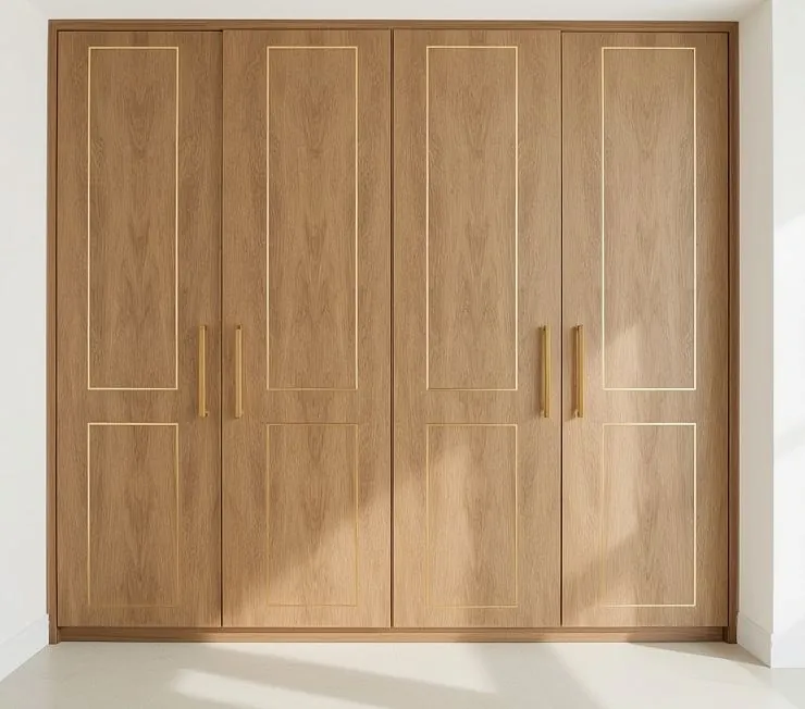 Элегантный современный шкаф с фасадами из натурального шпона светлого дерева. Украшен изящной инкрустацией латунными линиями, подчеркивающей геометрию фасадов. Стильные латунные ручки придают дизайну выразительность и премиальность. Отличный выбор для интерьеров в стиле современная классика, минимализм или арт-деко.