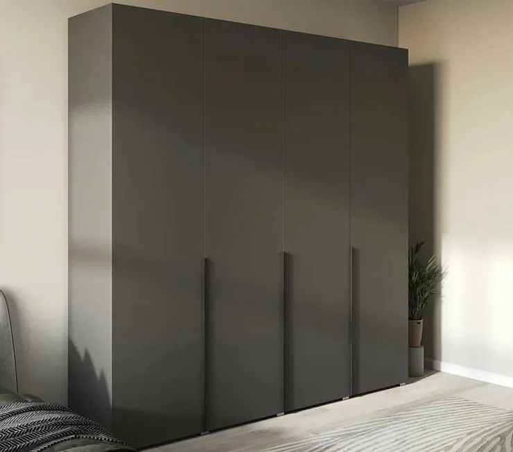 Нестандартный дизайн и строгий графитовый оттенок - идеальное сочетание для хай-тек обстановки в комнате. Идеально гладкая эмаль распашных фасадов МДФ и стильные ручки порадуют ценителей лаконичного дизайна. Внутреннее наполнение шкафа включает зоны для одежды, белья, ниши для обуви и антресоли. Комплектуется оригинальной австрийской фурнитурой “Blum”. Производится только под заказ.