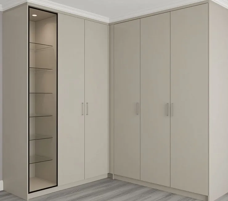 Минималистичный угловой шкаф в современном стиле, выполненный в мягком бежево-сером оттенке. Лаконичные фасады без лишнего декора дополняет стеклянная витрина с внутренней LED-подсветкой и стеклянными полками, что позволяет элегантно разместить аксессуары, книги или декоративные элементы. Идеально подходит для современных интерьеров, объединяя функциональность и эстетичность.
