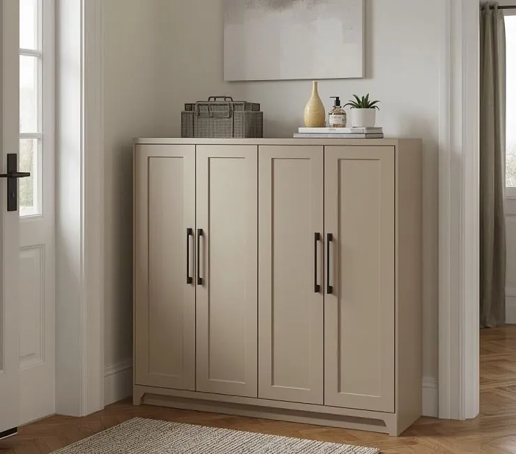 Элегантный и практичный шкаф для хранения обуви с четырьмя распашными дверцами и аккуратными ручками тёмного цвета. Мягкий оттенок тауп и строгие геометричные фасады подчеркивают современный стиль мебели. Идеально подходит для прихожей, где важна организация пространства без перегрузки интерьера. Возможно изготовление в любом цвете палитры RAL/NCS и с индивидуальной конфигурацией наполнения.