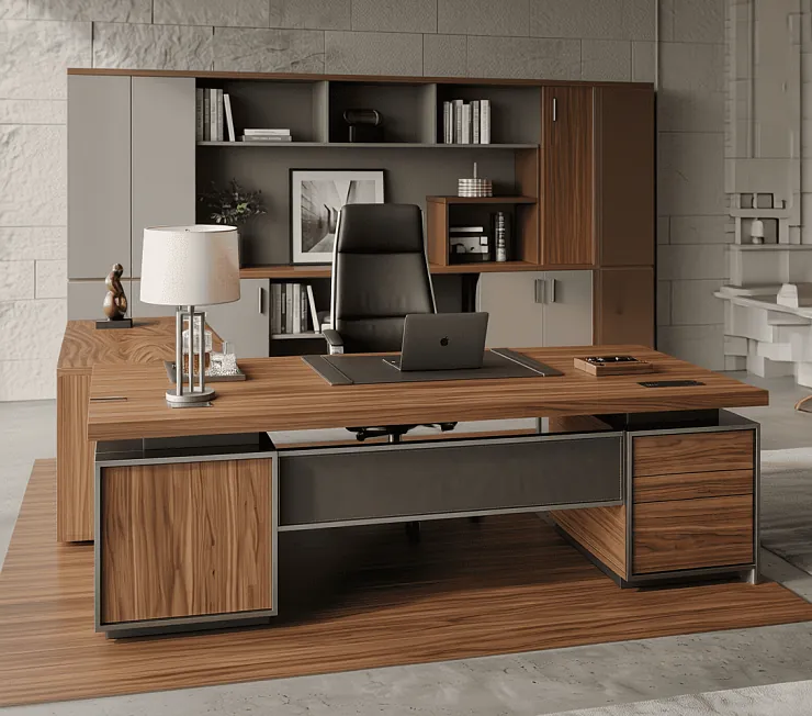 Современный офисный стол руководителя — это воплощение статуса, технологичности и эстетики. Массивная столешница из шпонированного ореха с богатой натуральной текстурой подчёркивает высокий уровень кабинета и вкус владельца. Вставка из натуральной или экокожи в рабочей зоне обеспечивает комфорт и бережное отношение к технике и документам.