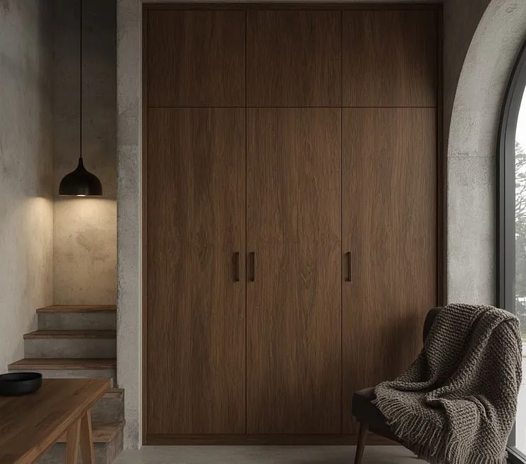 Минималистичный встроенный шкаф под лестницей, выполненный из МДФ с натуральной шпоновкой под орех. Гладкие фасады без лишнего декора подчёркивают современный индустриальный интерьер, а лаконичные вертикальные ручки в тон обеспечивают удобство открывания. Идеален для хранения одежды, аксессуаров или бытовых вещей, гармонично вписывается в пространство за счёт натуральной текстуры и тёплого оттенка.