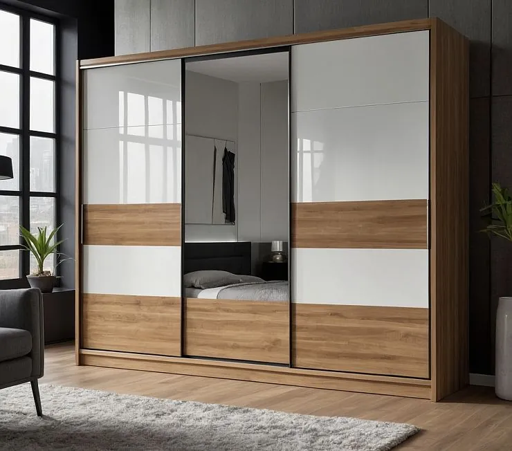 Стильный трехдверный шкаф-купе с комбинацией белого глянца, теплого древесного декора и центральной зеркальной вставки. Эффектное визуальное решение делает интерьер просторнее и светлее. Идеально вписывается в современный интерьер спальни или гостиной.