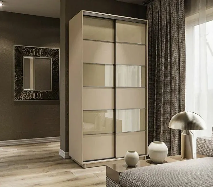 Компактный, стильный, вместительный, этот шкаф-купе подойдет для установки в небольших квартирах. Оригинальный дизайн фасадов, использующий крашеное с одной стороны цветное стекло, станет украшением любой спальни или гостиной. Используется оригинальная фурнитура “Hettich”, корпус - ламинированная ДСП высшего качества. Производится эксклюзивно, по индивидуальным размерам.