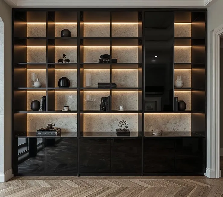 Современный стеллаж с подсветкой и черным глянцем