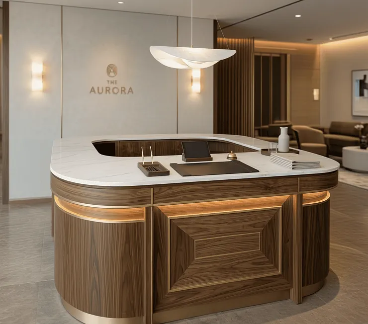 Такая стойка ресепшн идеально впишется в интерьеры класса люкс, выполненные в стиле современной классики или неоклассики. Плавные линии, эргономика и внимание к деталям создают максимальный комфорт для сотрудников и производят неизгладимое впечатление на гостей.