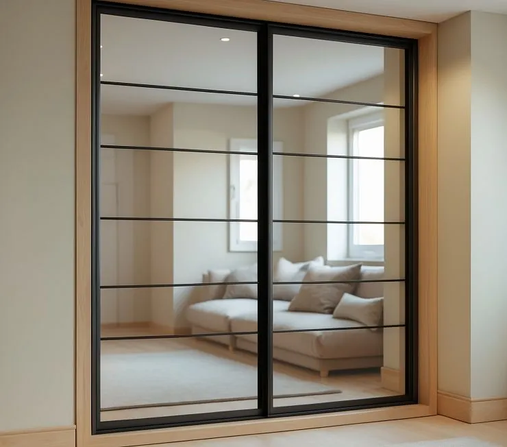 Элегантный встроенный шкаф-купе с двумя большими зеркальными раздвижными дверями и черной металлической раскладкой. Идеально подходит для спальни, прихожей или гардеробной. Зеркальные фасады визуально расширяют пространство, добавляя света и глубины комнате.