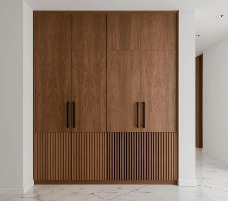 Лаконичный встроенный шкаф с геометричной композицией фасадов. Выполнен из МДФ с натуральным шпоном в тёплом ореховом тоне. Нижняя часть декорирована рифлёными панелями, создающими контраст текстур. Массивные чёрные ручки подчёркивают современный стиль. Идеален для коридора или гардеробной.