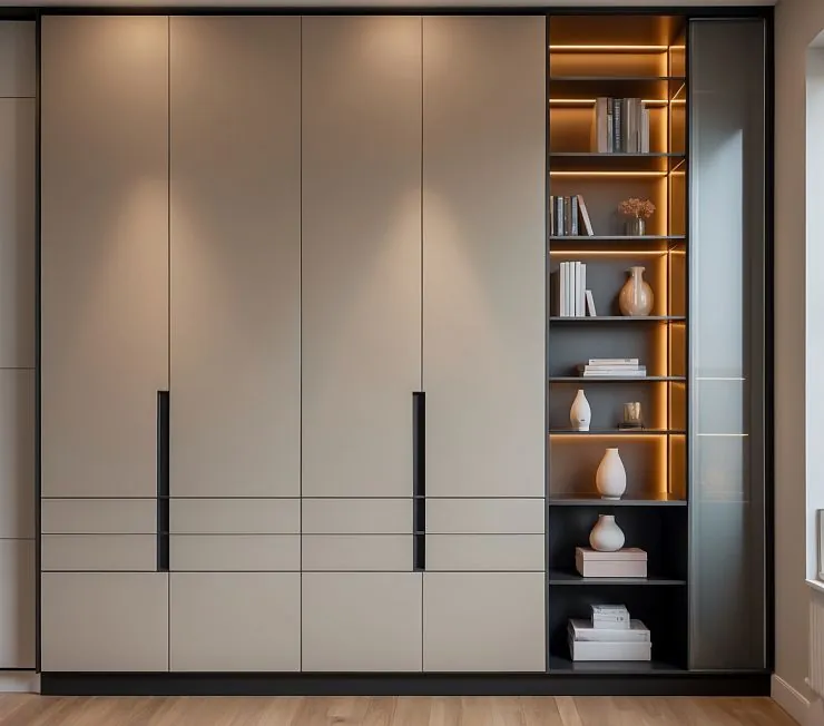 Элегантный встроенный шкаф в современном стиле, выполненный в матовых бежевых фасадах с вертикальными чёрными ручками-профилями. Справа размещена декоративная открытая ниша с полками, стеклянной дверцей и тёплой LED-подсветкой — идеальное решение для размещения книг, декора или посуды. Чистая геометрия, минимализм и натуральная цветовая гамма делают этот шкаф идеальным для современных интерьеров в стиле japandi, сканди или минимализм.