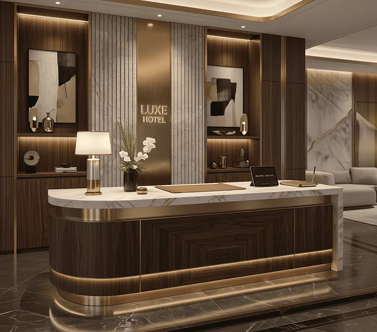 Современная стойка ресепшн для отеля премиум-класса — это гармоничное сочетание безупречного дизайна, премиальных материалов и функциональности. Модель выполнена из шпонированной МДФ под орех с выразительной текстурой и глубоким тёплым оттенком. Эффектные акцентные вставки из латуни и закруглённые углы придают стойке утончённость и подчёркивают статус пространства.