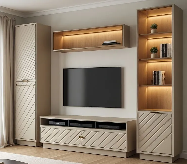 Современная модульная композиция для гостиной, выполненная в светло-бежевом цвете с диагональным фрезерованием фасадов. Контрастные акценты из натурального дуба создают уют и визуальный ритм. Открытые ниши с теплой LED-подсветкой — идеальное место для книг и декора. Телевизионная тумба оборудована нишами для аудиовидео-техники и закрытым хранилищем. Верхняя горизонтальная полка визуально уравновешивает композицию и обеспечивает дополнительное место для хранения.