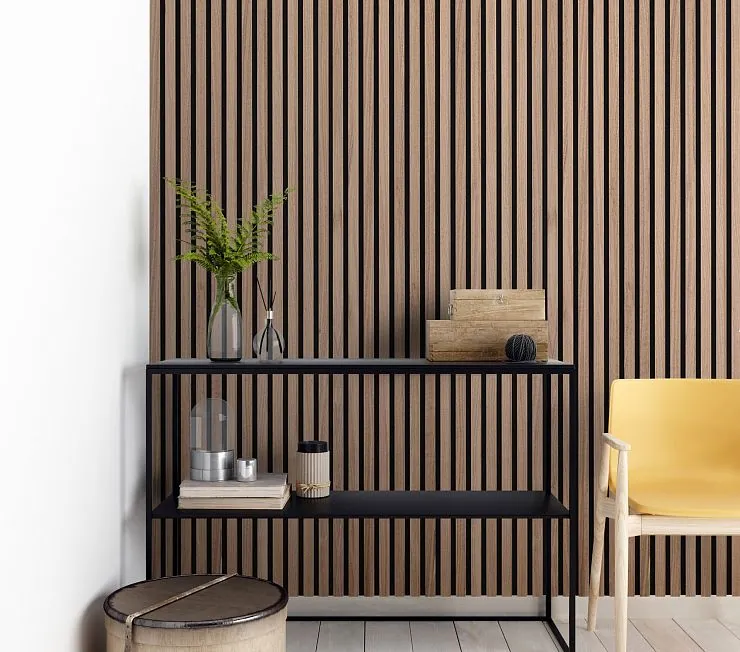 Рейка имеет отделку из гладкого шпона, обладает очень хорошими акустическими свойствами, кардинально преобразует пространство