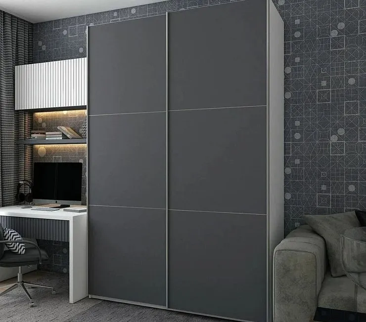 Встроенный шкаф с раздвижными створками матово-черного цвета. Внутреннее пространство оборудовано всем необходимым для хранения одежды: штанга, полки, выдвижные ящики для белья. Каркас изготовлен из высококачественного МДФ, фасад - закаленное стекло. Используется фурнитура от “Hettich”. Шкаф требует вызова замерщика, производится только под заказ.