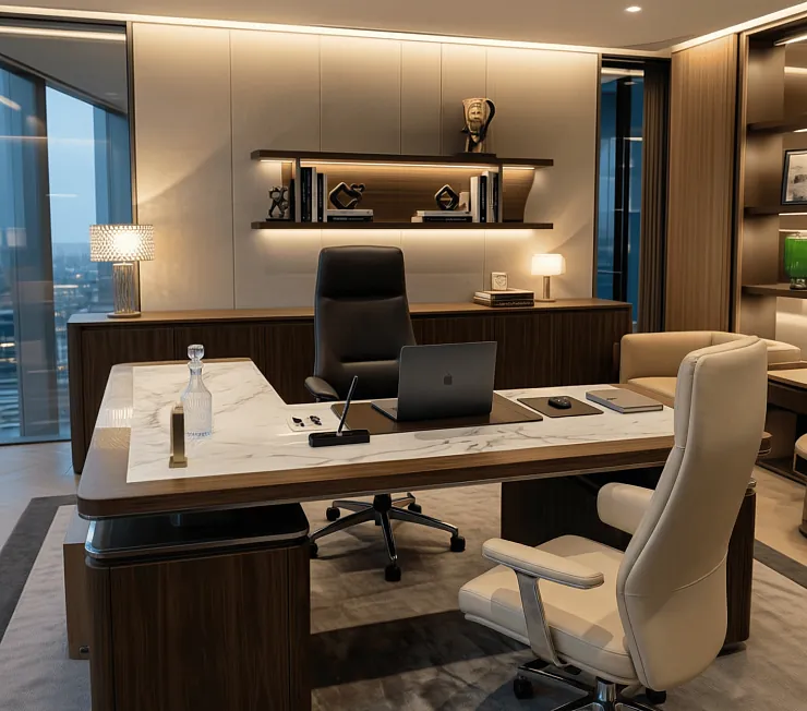 Декоративные вставки из матового металла и скруглённые края подчеркивают современный стиль и премиальный уровень исполнения. Интегрированные тумбы обеспечивают вместительное и скрытое хранение документов и аксессуаров, сохраняя идеальный порядок на столе. Парящий эффект столешницы создаёт ощущение лёгкости и визуально расширяет пространство кабинета.