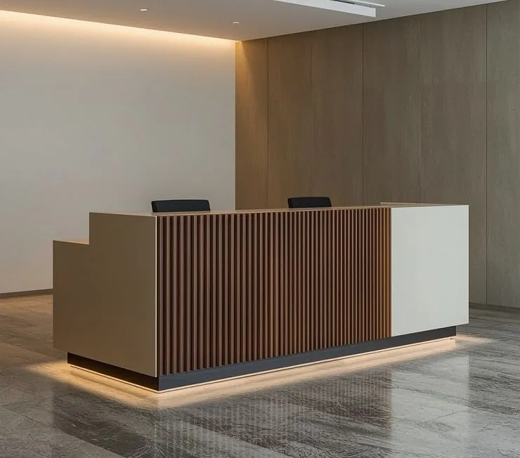 Современная стойка ресепшн с акцентной ламельной панелью и геометричным силуэтом. Контрастное сочетание гладкого матового покрытия и фактуры дерева создаёт элегантный и статусный образ. Встроенная LED-подсветка по периметру основания подчёркивает парящую форму и добавляет выразительности.