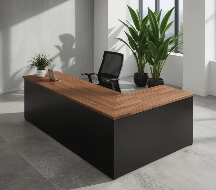 Элегантная угловая стойка ресепшн в форме «L» с выразительным современным дизайном. Верхняя столешница выполнена под шпон ореха, а основание — в матовом черном цвете. Эта стойка отлично впишется в стильный офис, шоурум или коворкинг. Форма и размеры обеспечивают комфорт для администратора и отличную обзорность при работе с клиентами.