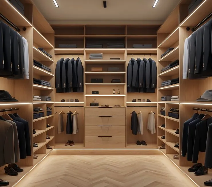 Функциональная гардеробная в отделке под светлый дуб с открытым наполнением и встроенной светодиодной подсветкой. Компоновка рассчитана на деловой гардероб: множество секций под костюмы, обувь, рубашки и аксессуары. Центральный модуль с выдвижными ящиками подчёркивает симметрию. Подходит для интерьеров в современном и минималистичном стиле.