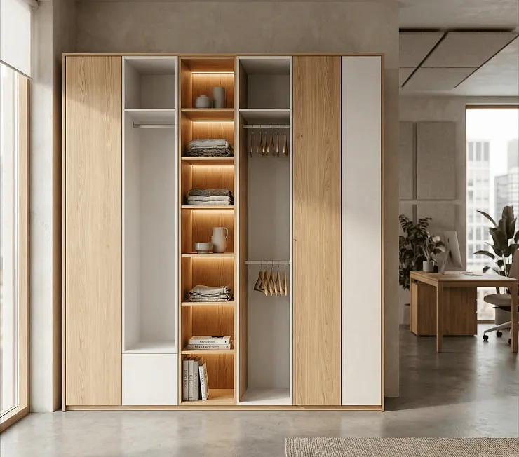 Дизайнерский шкаф для офиса — идеальное решение для современных и функциональных рабочих пространств. Модель выполнена в стиле минимализм с элементами скандинавского дизайна, что придаёт интерьеру лёгкость, строгость и уют. Комбинация фасадов из натурального дубового шпона (матовый лак) и белого матового МДФ (RAL 9003) смотрится свежо и стильно, а открытые полки с LED-подсветкой превращают шкаф не только в систему хранения, но и в изящный элемент декора.