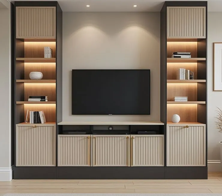 Элегантная мебельная композиция в современном стиле с акцентом на вертикальную рифлёную фрезеровку фасадов и контраст между мягким бежевым и глубоким графитом. Открытые полки с тёплой подсветкой создают атмосферу уюта и подойдут как для хранения книг, так и для декора. Фасады украшены аккуратными латунными ручками, придающими композиции нотки изысканности.