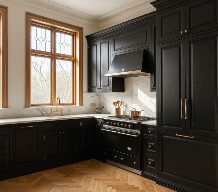 Угловая кухня в глубоком чёрном цвете с филёнчатыми фасадами и столешницей из белого мрамора Calacatta Oro. Контраст чёрного и белого с золотистыми прожилками камня — классическое сочетание, которое никогда не устаревает и всегда выглядит дорого.