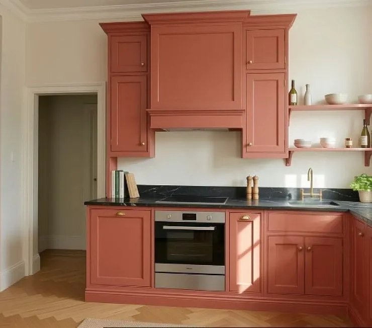 Все фасады — рамочные (филёнка), МДФ или массив в матовой эмали тёплого терракотового оттенка (близко к Farrow & Ball «Red Earth»). Декоративный каминный портал вытяжки с карнизным профилем. Столешница — натуральный мыльный камень (soapstone) или чёрный мрамор, тёмно-серый с тонкими светлыми прожилками, матовая поверхность. Фартук отсутствует — стена окрашена в кремовый. Открытые полки на фигурных кронштейнах в тон фасадов. Колонна встроенного холодильника с филёнчатым фасадом и карнизом. Фурнитура — латунные кнопки, ручки-ракушки и рейлинги. Смеситель — латунь, классический. Пол — дубовый паркет «ёлочкой».