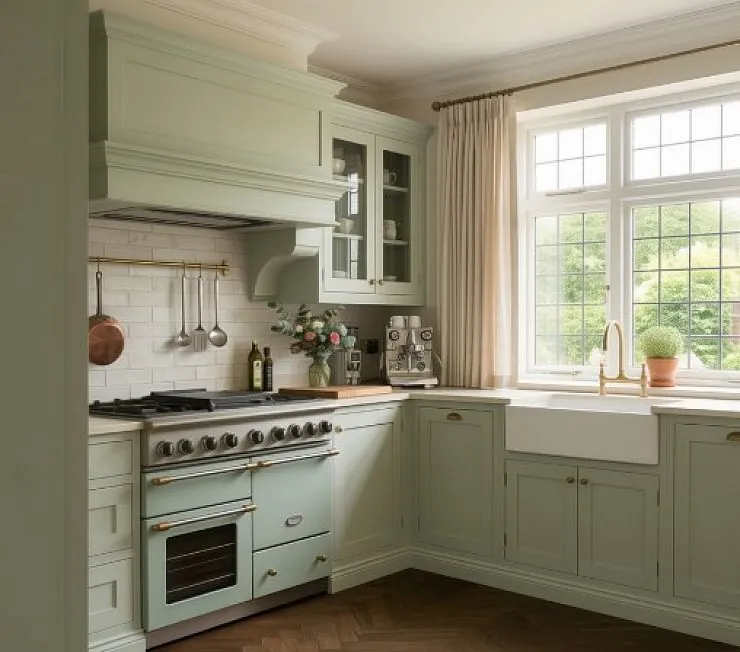 Угловая кухня в классическом/кантри стиле: матовые филенчатые фасады в шалфейном цвете, слева блок высоких шкафов (в т.ч. под встроенный холодильник), фартук «кабанчик», столешница из светлого камня, мойка farmhouse (фартук раковина), латунная фурнитура и смеситель. Габариты: 3600 × 2600 мм, высота 2750 мм, глубина 600 мм.
