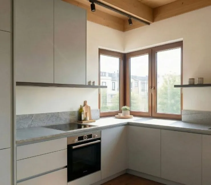 Все фасады — МДФ в матовой эмали тёплого светло-серого оттенка (кашемир / greige, близко к RAL 7044), гладкие, без фрезеровки. Столешница — гранит или кварц с зернистой серой текстурой (тип Bianco Sardo). Фартук — узкая полоса того же камня. Вдоль стены с окном — тонкая открытая полка тёмного тона вместо верхних шкафов. Встроенная техника: холодильник Siemens в колонне, духовой шкаф Bosch, индукционная панель. Смеситель — матовый хром. Фурнитура — безручечная система. Потолок — открытые деревянные балки с чёрными трековыми спотами. Пол — дубовая доска.