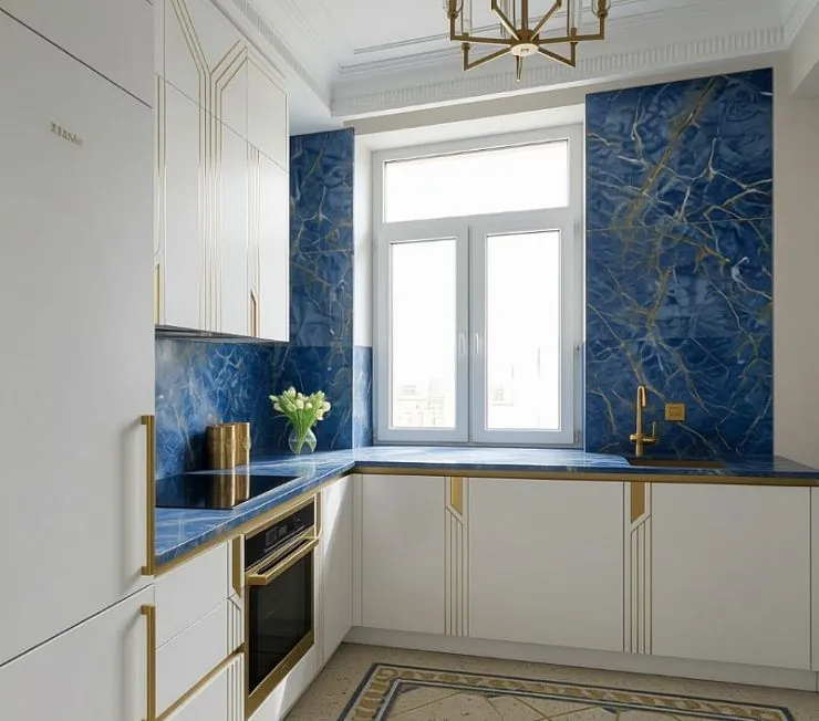 Главный акцент кухни — столешница и фартук из натурального синего мрамора Sodalite Blue. Насыщенный синий с белыми и золотистыми прожилками создаёт эффект драгоценного камня, а единая каменная плоскость от рабочей поверхности до потолка у окна придаёт интерьеру монументальность. Золотая фурнитура, обрамление духового шкафа Miele и люстра с латунным каркасом завершают образ.