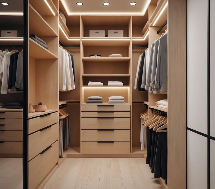 Современная угловая гардеробная в светлом дереве с функциональной компоновкой и элегантным дизайном. Чёрные интегрированные ручки подчёркивают геометрию ящиков, а мягкая LED-подсветка по периметру придаёт уют и глубину. Встроенные секции включают полки, вешала для одежды, ящики и отделения для коробок. Слева — глянцевая панель с зеркалом в полный рост, справа — стильная перегородка с японскими нотками (в стиле шоджи).
