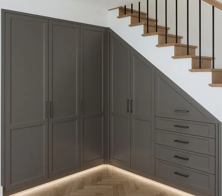 Просторный встроенный шкаф, идеально вписанный под лестницу, с комбинированной системой хранения: распашные двери для крупных вещей и выдвижные ящики для мелочей. Лаконичный серый матовый фасад и интегрированная LED-подсветка по периметру создают современный и уютный вид.