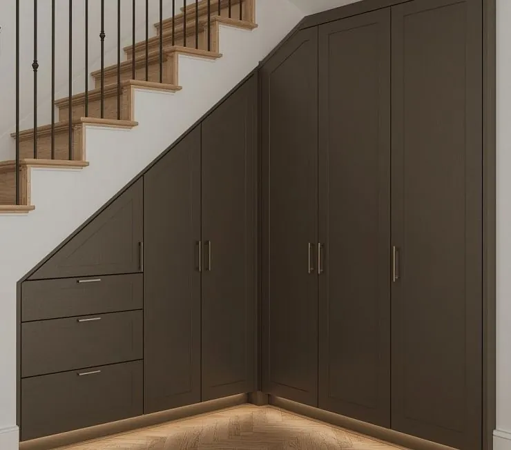 Индивидуально спроектированный угловой шкаф, встроенный под лестницу, выполнен в глубоком шоколадно-коричневом оттенке. Сочетает распашные фасады с классическими филёнками и выдвижные ящики, что обеспечивает удобное и функциональное хранение. Подсветка цоколя добавляет современный штрих и визуально облегчает конструкцию.