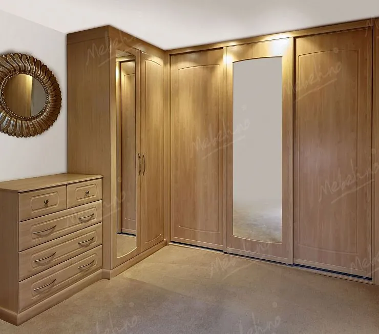 Угловая модель с комбинированными дверями шкафа (с раздвижной / распашной конструкцией). Оборудована подсветкой. Может дополняться антресолью, тумбами, комодами.