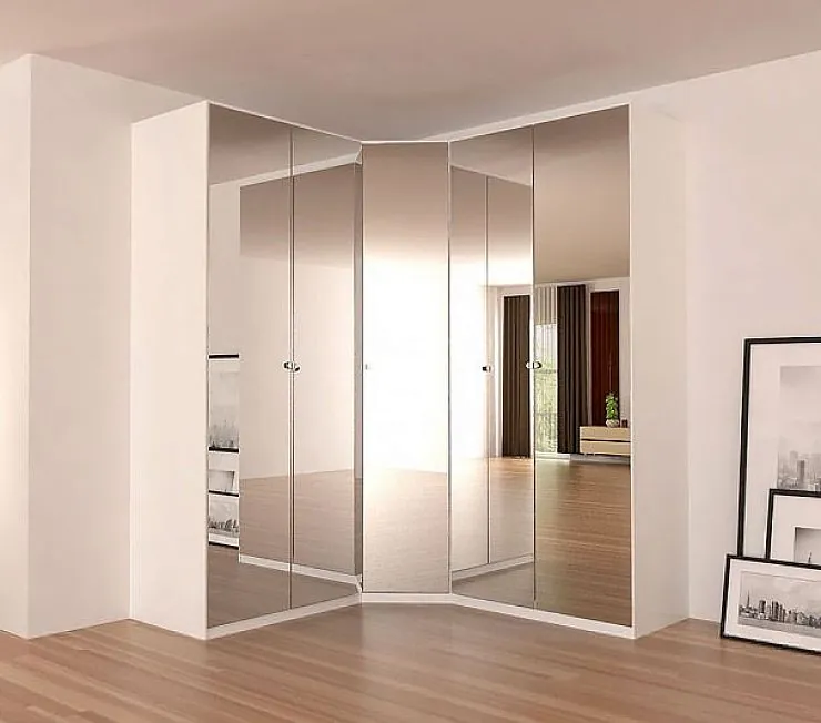 Зеркала от пола до потолка на фасаде шкафа визуально расширят пространство комнаты. Внутреннее наполнение можно выполнить для гардеробной или прихожей. Обладатель зеркального углового шкафа сможет увидеть себя сразу с нескольких сторон.