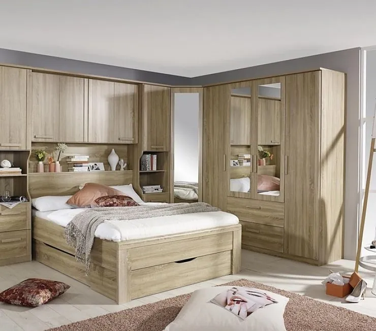 Угловой комплект мебели для спальни в современном стиле. Изготавливается на заказ по размерам спальни. В мебельный комплект входят: распашной гардеробный шкаф с зеркалом, подвесные шкафчики, шкафы-пеналы с полками и выдвижными ящиками, угловой зеркальный шкаф и кровать с очень большим выдвижным ящиком. Матрас приобретается отдельно.