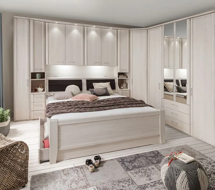Эксклюзивный комплект мебели для покупателя из Москвы, который не согласен на стандарты. Гарнитур состоит из двух систем хранения соединённым угловым шкафом. У изголовья кровати узкие шкафы имеют стеллажные полки и выполняют роль прикроватных тумбочек. Антресоли с подсветкой. Вдоль второй стены располагается зеркальный шкаф для спальни. Купить можно в цвете вашего интерьера. Материал мебели на выбор: массив дерева, ЛДСП или МДФ в шпоне, под приемлемую цену.