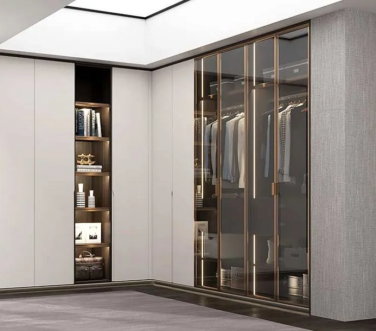 Встроенный в нишу угловой шкаф с оригинальной комбинацией глухих фасадов и распашных створок из стекла. В комплект входит пенал полками. Шкаф можно адаптировать для прихожей. На стеклянные створки нанести фотопечать или пескоструйный рисунок. Собственное производство в Москве.