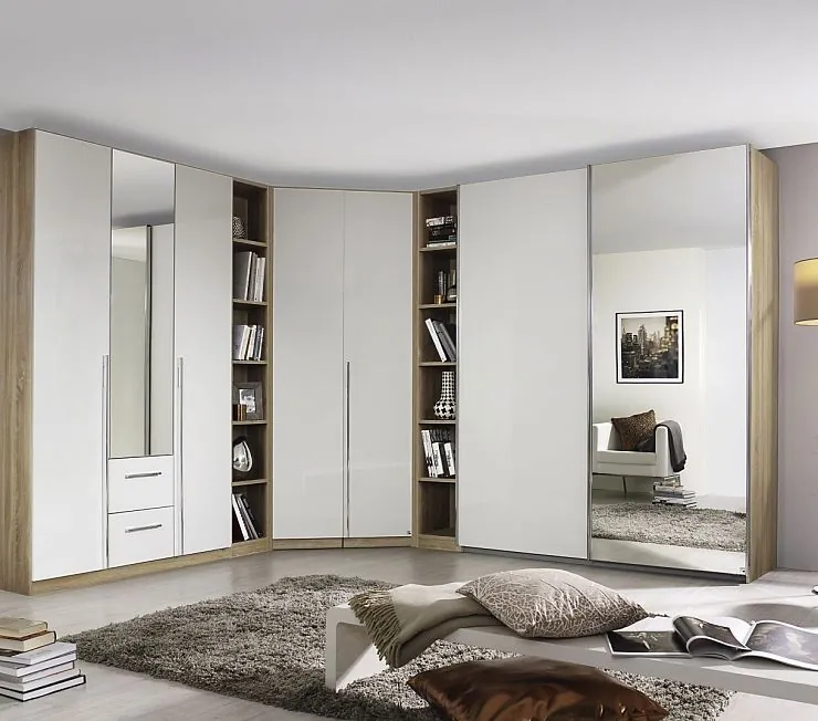 Светлый модульный шкаф угловой конструкции с выдвижными ящиками, открытыми полками и распашными дверями в глянцевой эмали и с зеркалами. Возможно увеличение полок для домашней библиотеки. Качество и размеры белее чем оправдывают цену.
