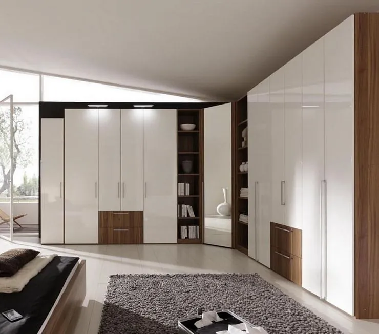 Большая и вместительная система хранения, оборудованная закрытыми отделами, наружными ящиками и открытыми стеллажами. Распашные фасады из МДФ в глянцевой белой эмали стильно сочетаются с текстурой шпона натуральной древесины. Угловая секция оснащена зеркальным фасадом. Использована оригинальная австрийская фурнитура “Blum”. Производится по индивидуальным размерам.