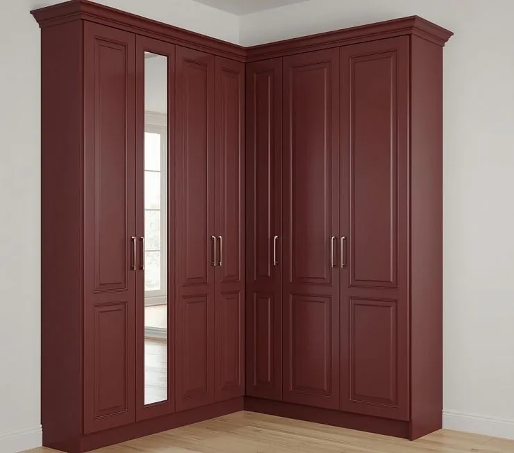 Стильный угловой шкаф в насыщенном бордовом цвете с классическими филенчатыми фасадами. Одна из дверей оснащена встроенным зеркалом в полный рост, что делает шкаф не только функциональным, но и визуально увеличивает пространство комнаты. Прекрасно подойдет для спальни, гардеробной или просторного коридора, добавив интерьеру выразительный акцент.
