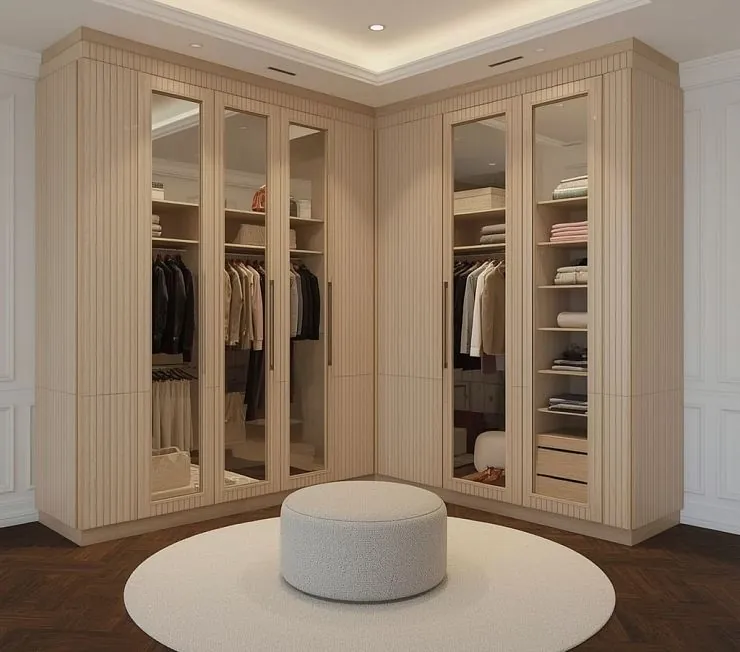 Современный угловой шкаф-гардеробная в светлых тонах с вертикальным фрезерованным декором фасадов и вставками из зеркал. L-образная конструкция обеспечивает максимальное использование угла комнаты, а открытые и закрытые секции позволяют хранить одежду, обувь и аксессуары в идеальном порядке. Зеркальные панели визуально расширяют пространство, а встроенная подсветка создаёт атмосферу уюта и премиальности.