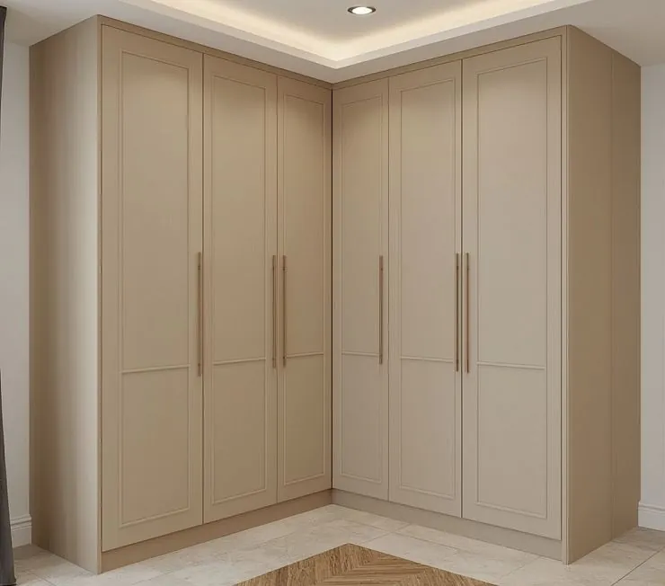 Элегантный угловой шкаф в мягких карамельных оттенках, выполненный в минималистичном стиле. L-образная конструкция идеально подходит для рационального использования углового пространства, а высокие фасады с тонкой рамкой придают дизайну изысканность. Длинные вертикальные ручки подчеркивают высоту шкафа и делают его ещё более стильным.