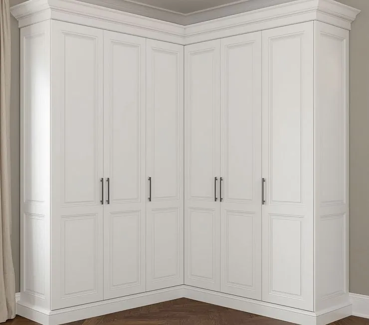 Элегантный угловой шкаф в классическом стиле, выполненный в белоснежном цвете с фигурными филенками на фасадах. Декоративный карниз придает конструкции завершенный и изысканный вид. Модель идеально впишется в спальню, гостиную или гардеробную, обеспечивая максимум хранения при минимальном использовании площади.