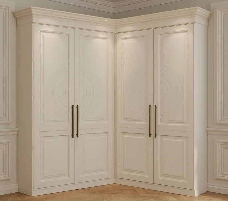 Роскошный угловой шкаф в нежном кремовом оттенке с утончённым рельефным узором в виде концентрических кругов на фасадах. Классическая форма сочетается с современными деталями, такими как встроенная светодиодная подсветка в верхнем карнизе и удлинённые металлические ручки. L-образная конструкция обеспечивает оптимальное использование углового пространства, а внутреннее наполнение можно адаптировать под ваши нужды — от полок до выдвижных ящиков и штанг для одежды.