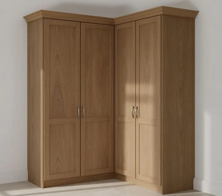 Классический угловой шкаф, выполненный из высококачественного материала с отделкой под натуральный дуб. L-образная форма идеально подходит для рационального использования углового пространства, а минималистичный дизайн и аккуратные серебристые ручки гармонично вписываются в любой интерьер. Шкаф подойдёт как для спальни, так и для прихожей или гардеробной.