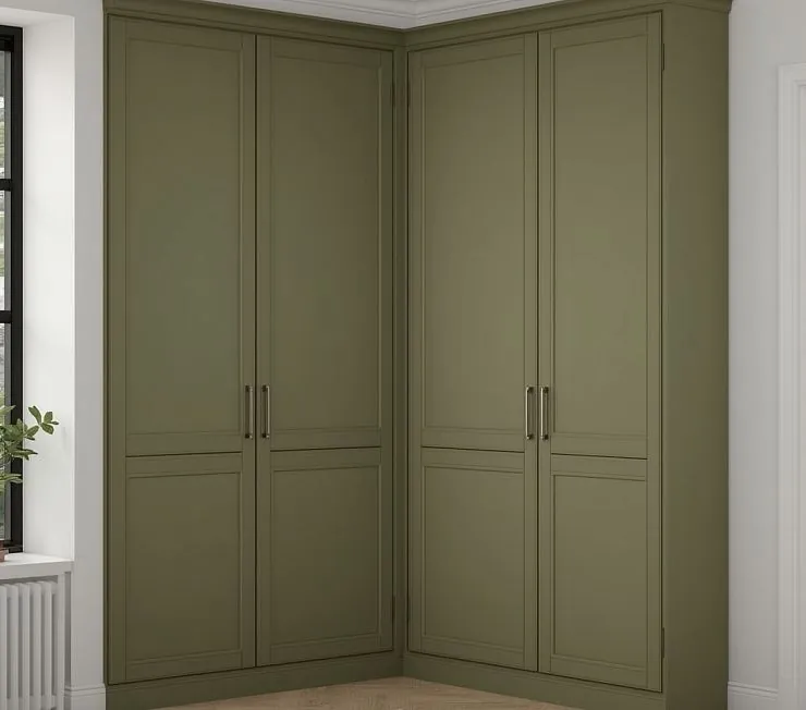 Стильный угловой шкаф в матовом оливковом цвете, который придаст интерьеру атмосферу уюта и природной гармонии. L-образная конструкция идеально подходит для рационального использования углового пространства. Лаконичные фасады с тонкими рамочными филёнками и металлические ручки подчёркивают современный минимализм с нотками классики. Шкаф оснащён просторными секциями для хранения одежды, аксессуаров и других вещей.